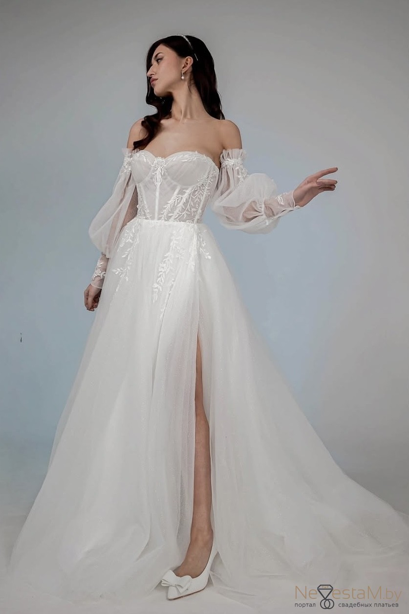 Корсетное мерцающее свадебное платье со съёмными рукавами буфами. Пышная юбка с разрезом. Размер - 42-44. _________________________________ Больше моделей в нашем профиле в инстаграм.