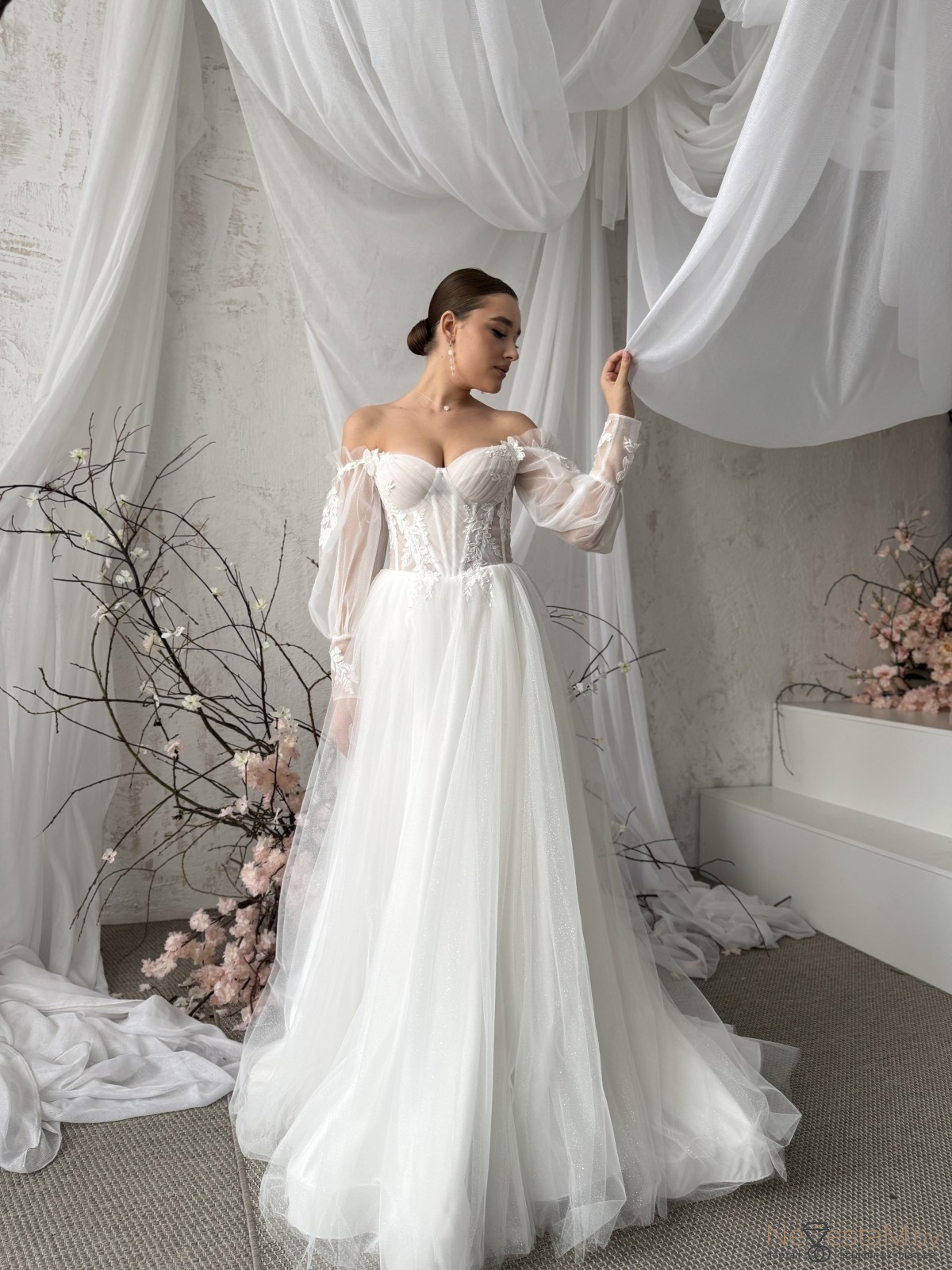 Корсетное мерцающее свадебное платье с рукавами. Пышная лёгкая юбка с разрезом. Размер - 42-44-46. _________________________ Больше моделей в нашем профиле в инстаграм.