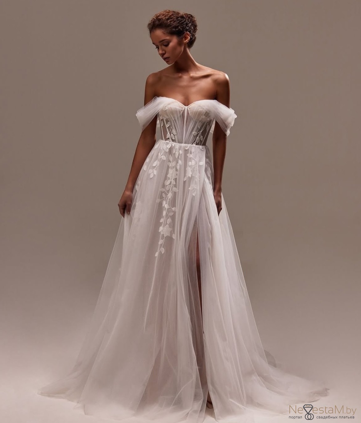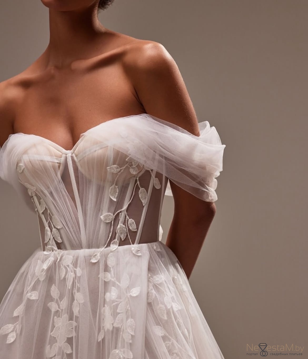 Корсетное свадебное полупрозрачное платье со спущенными плечиками. Расшитое красивым кружевом листьями. Размер - 42-44. _________________________ Больше моделей в нашем профиле в инстаграм.