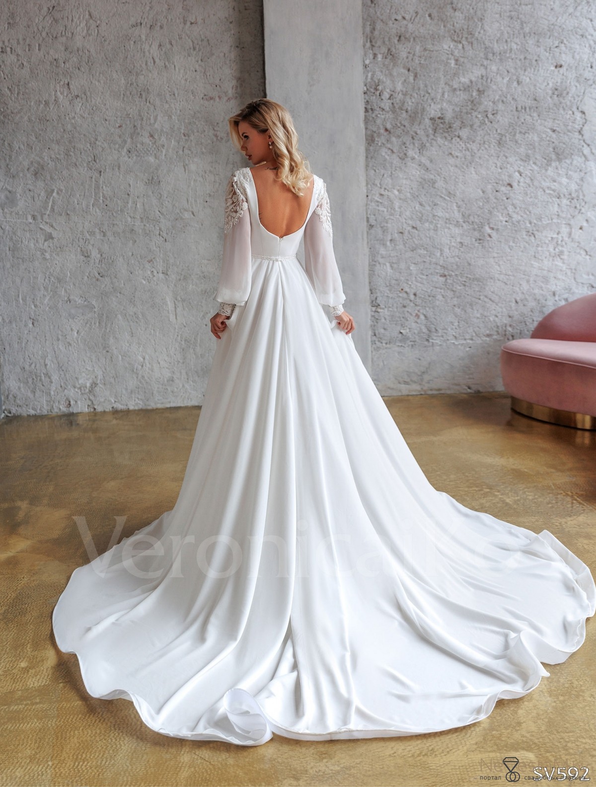 Свадебное платье с V-образным вырезом и расшитыми кружевом рукавами. Мягкая струящаяся ткань - креп. Размер - 44-46-48. _________________________ Больше моделей в нашем профиле в инстаграм.