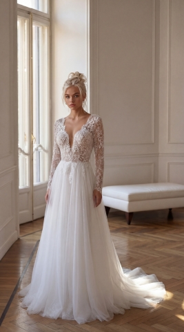 - Наличие рукавов в модели придает лику невесты интеллигентность.