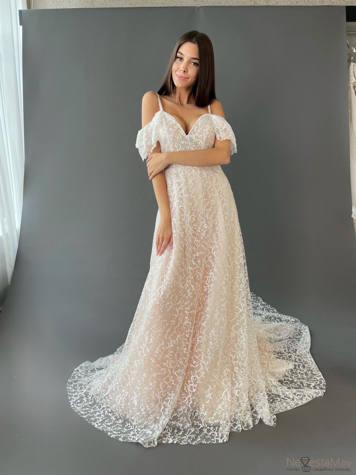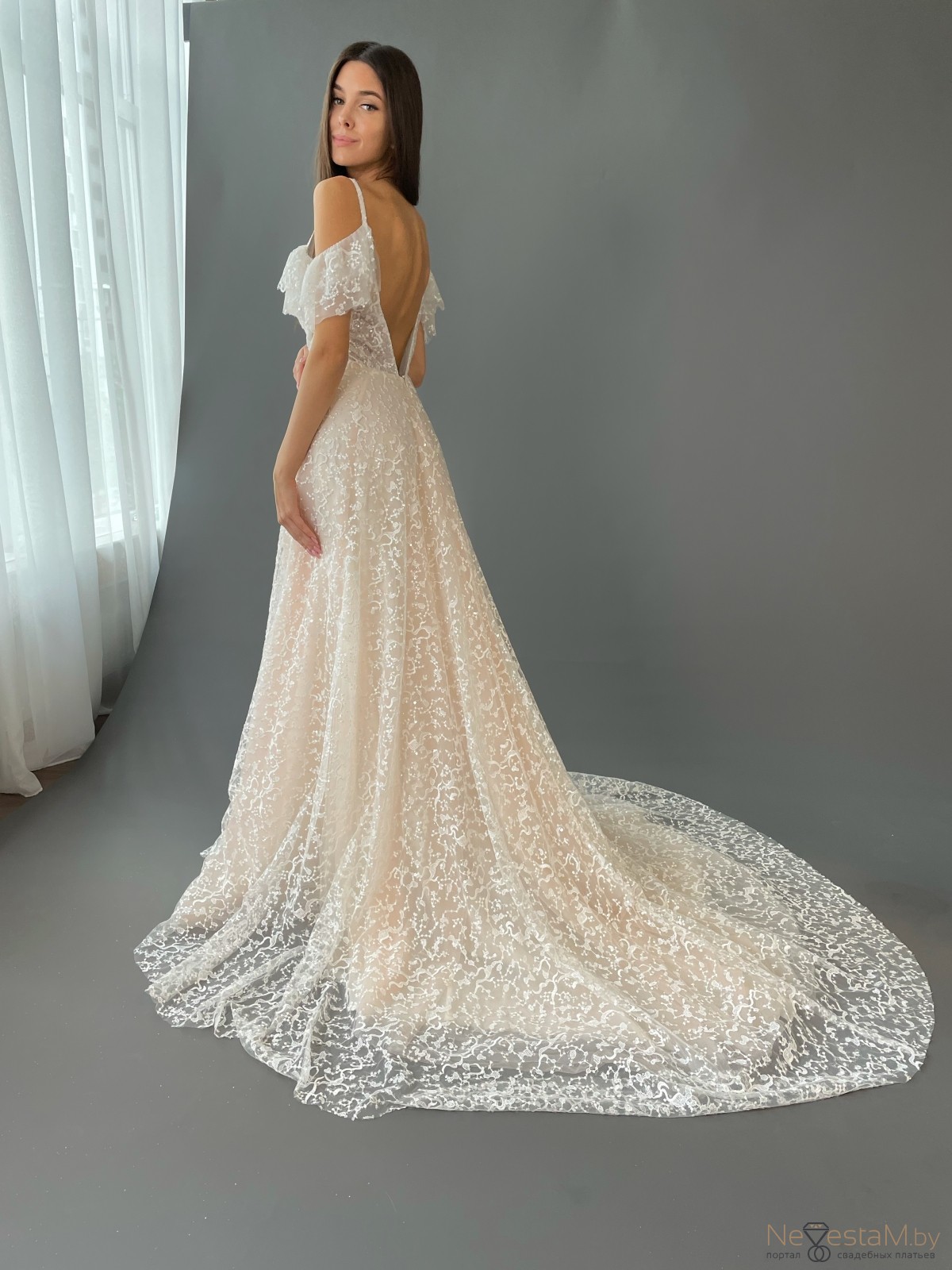 Свадебное платье с нежным блеском и небольшим шлейфом.