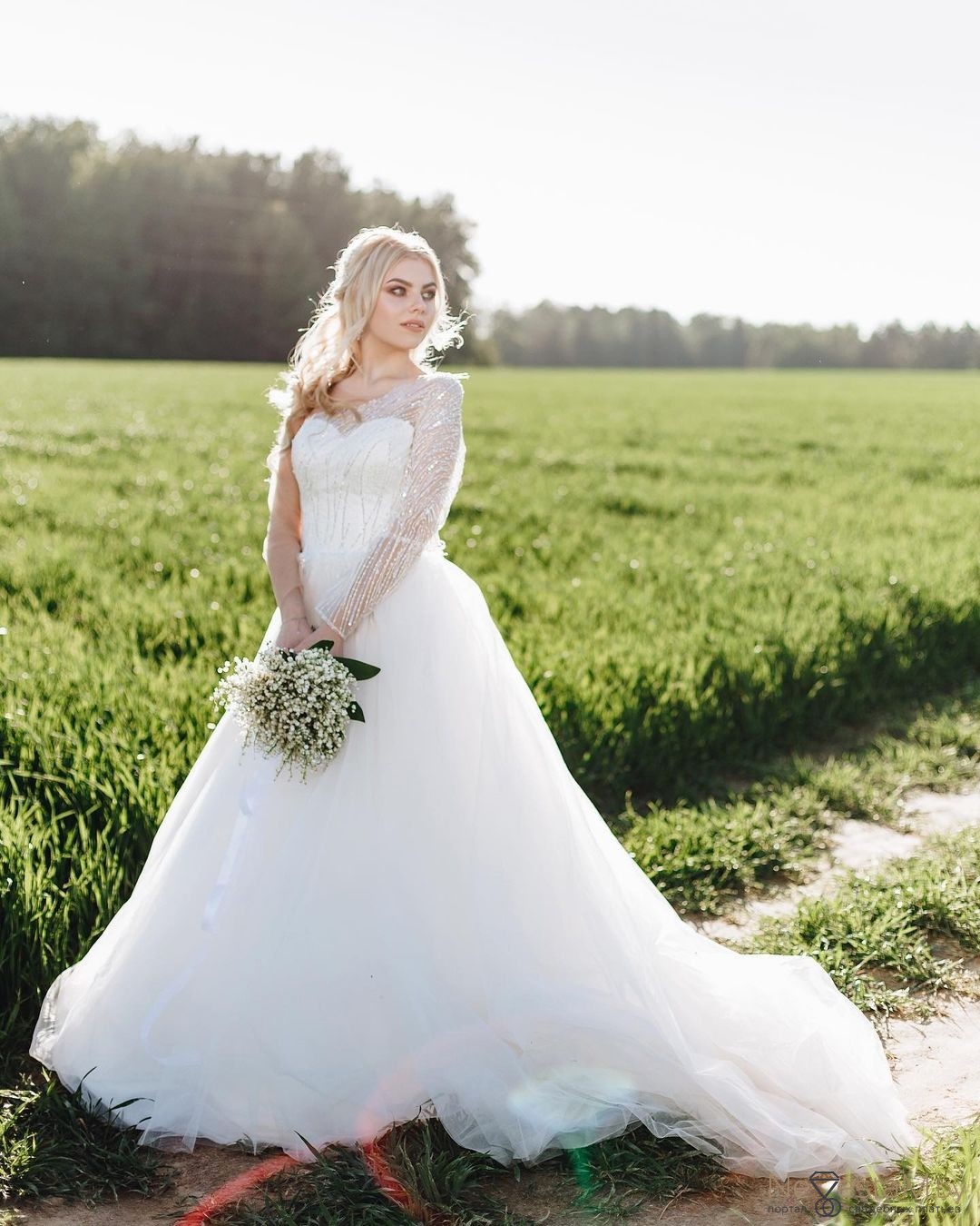 Свадебное платье "Санторини" с одним рукавом и сатиновой юбкой.
