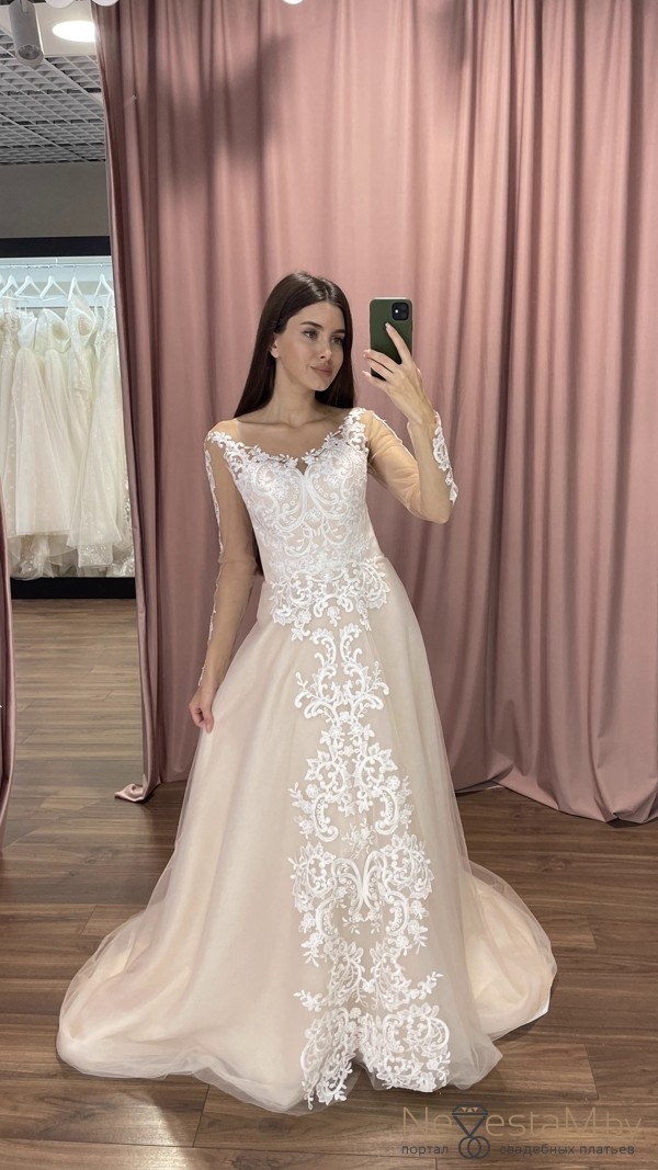Кружевное свадебное платье со шлейфом. Цвет пудра.