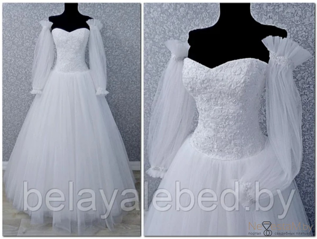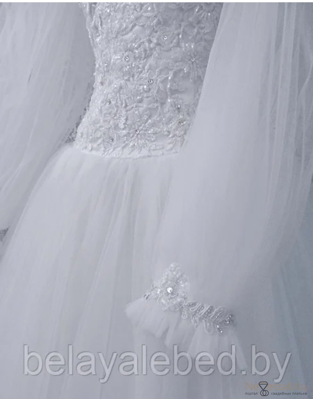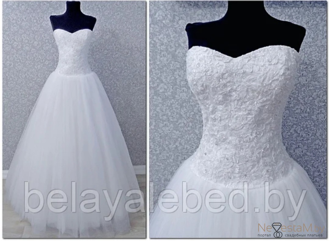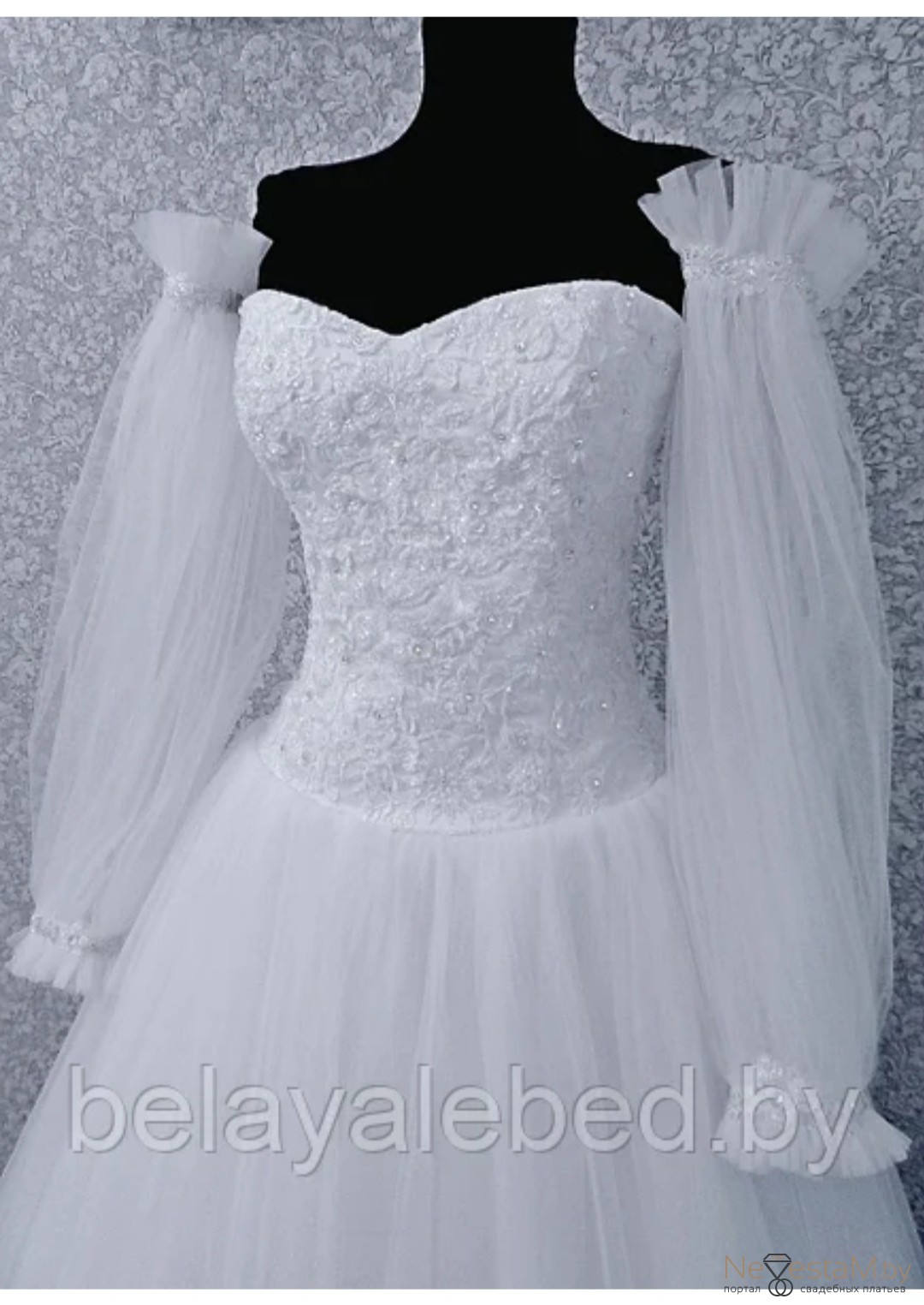 Изумительное фатиновое платье для настоящих принцесс,корсет расшит стразами Сваровски и стеклярусом. Пышность можно регулировать кольцами. Вырез ты форме(сердца). Спинка на широкой шнуровке.По желанию невесты можно добавить съёмные рукава фонарики,украшены бисером и стеклярусом. В таком платье Вы почувствуете себя настоящей принцессой.