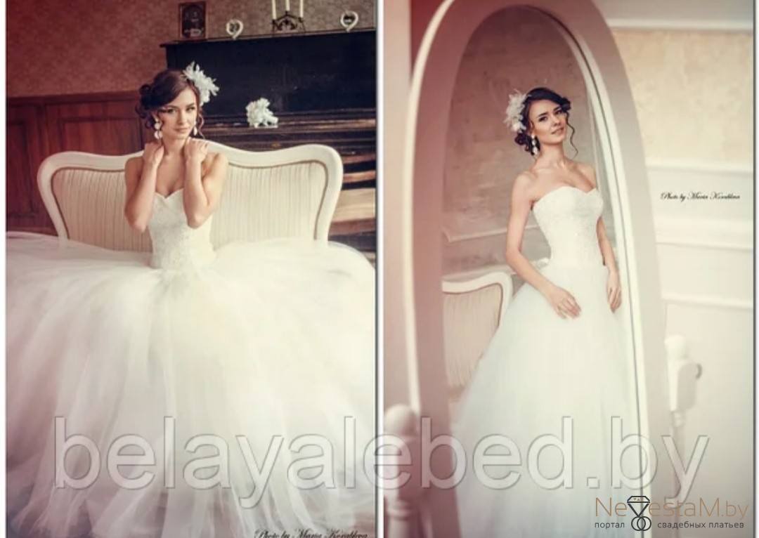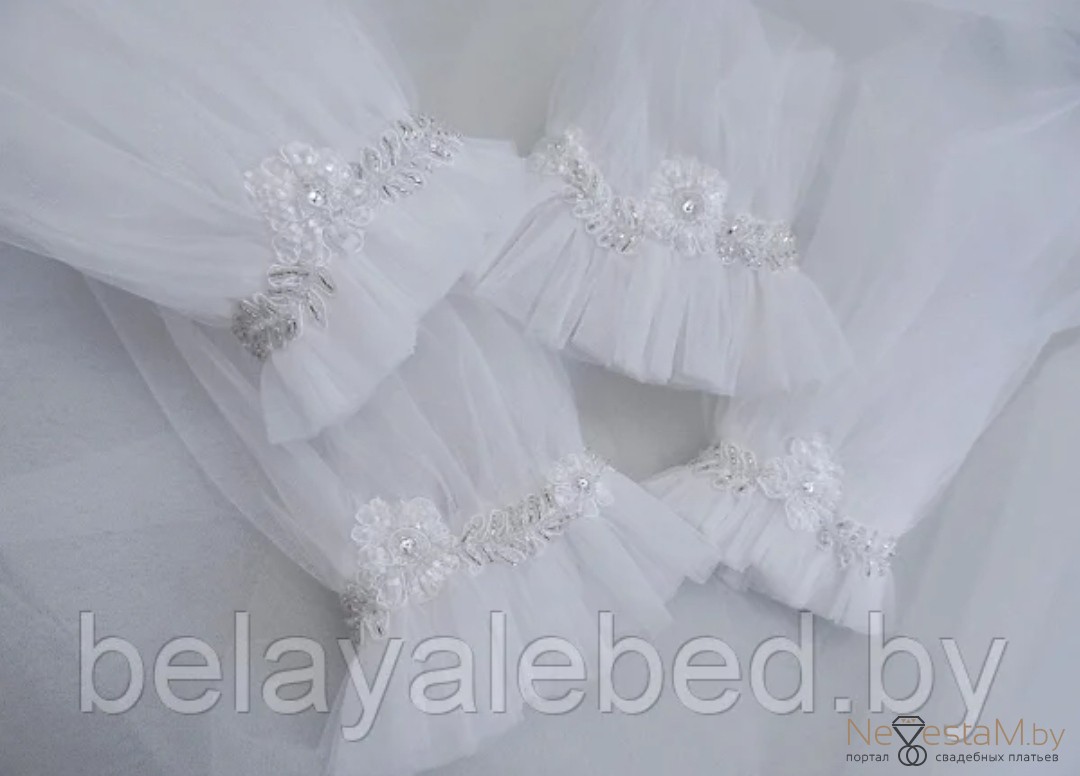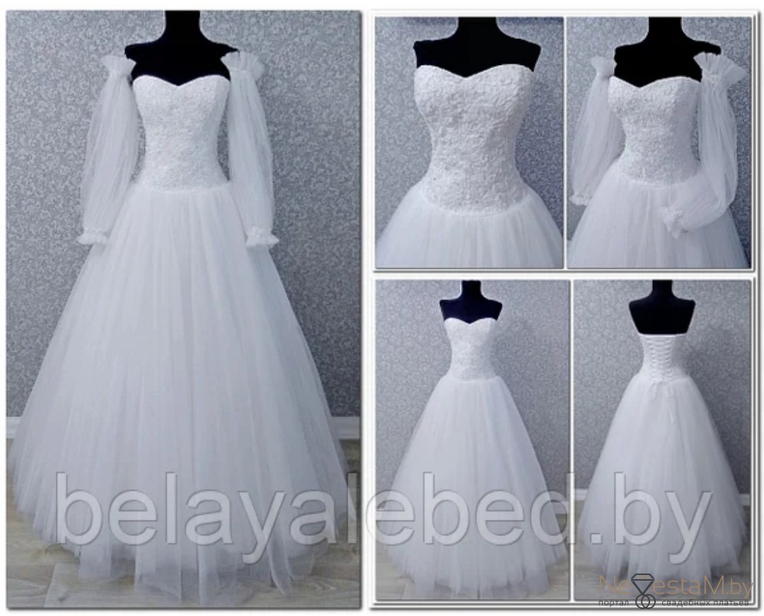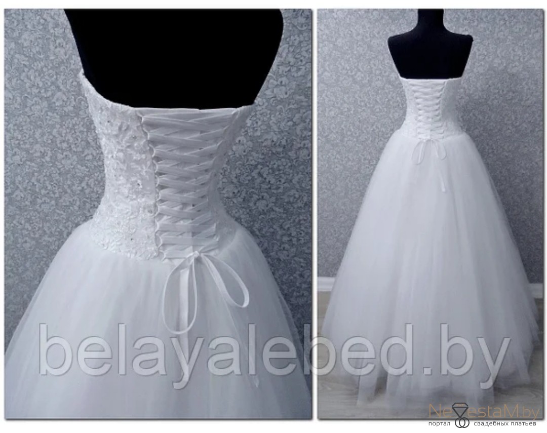 Изумительное фатиновое платье для настоящих принцесс,корсет расшит стразами Сваровски и стеклярусом. Пышность можно регулировать кольцами. Вырез ты форме(сердца). Спинка на широкой шнуровке.По желанию невесты можно добавить съёмные рукава фонарики,украшены бисером и стеклярусом. В таком платье Вы почувствуете себя настоящей принцессой.