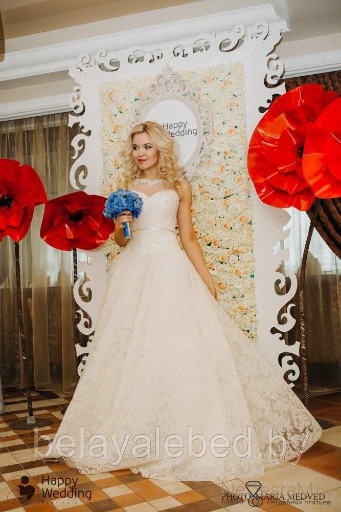 Симона.Цвет айвори Ткань: атлас, верхний слой бархатный узор.А-силует. Для пышности можно добавить кольца. Небольшой шлейф. В таком платье любая невеста почувствует себя приятный бонус для невесты; Бижутерия, сумочка и перчатки в прокат совершенно бесплатно