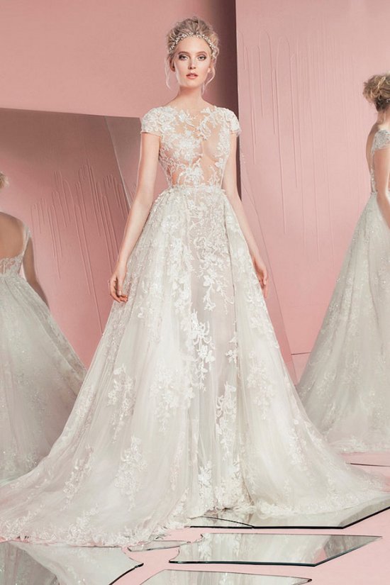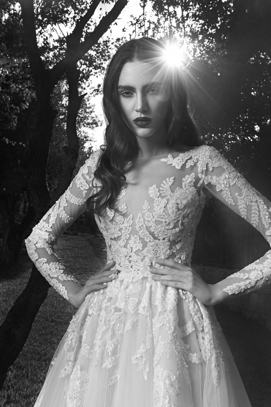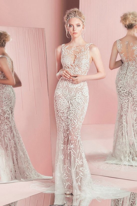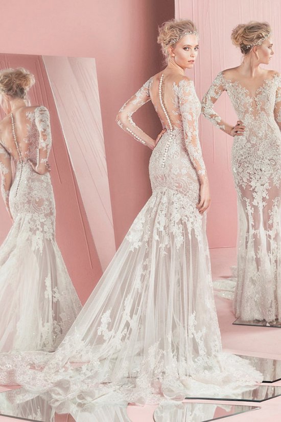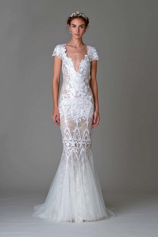 Практически в каждой дизайнерской коллекции 2016 можно заметить наряды с прекрасным кружевом, который дает эффект татуировки — это настоящий хит будущего сезона! Чаще всего выбор падает на декольте или спину, где сетка телесного цвета украшается великолепными узорами. Зрелище поистине волнующее, подобная роскошь смотрится великолепно на любом фасоне свадебного платья.