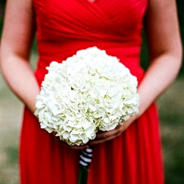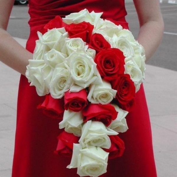 К алому платью хорошо подходят бело-красные букеты. Такие композиции подчеркнут общий стиль, сделав его немного более контрастным. Такой вариант прекрасно подойдет к красно-белому свадебному наряду.