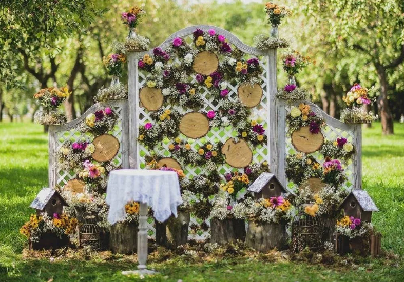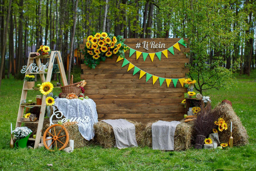 - Летняя фотозона идеально подходит для организации на природе с красивым пейзажем. Установите декорированные качели, украсьте тканью и цветами красивое дерево и оформленная фотозона готова;