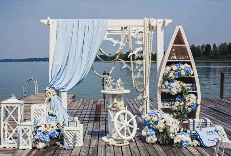 - Морской – оригинальное оформление фотозоны в морском стиле с использованием элементов корабельного снаряжения, ракушек, морских звезд, сундука. Для морской тематики обычно выбирают синие, белые, голубые оттенки с вкраплением серебра;