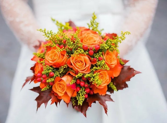 Букет из роз – это всегда актуальная классика. Составить роскошный букет, уместный на торжественном пышном празднике, и при этом передать дух осени помогут крупные оранжевые или бордовые бутоны. Такой букет может быть однотонным или содержать множество оттенков оранжевого, сепии или красного. Дополнить цветы можно кленовыми листьями, рябиной или нитью жемчуга.