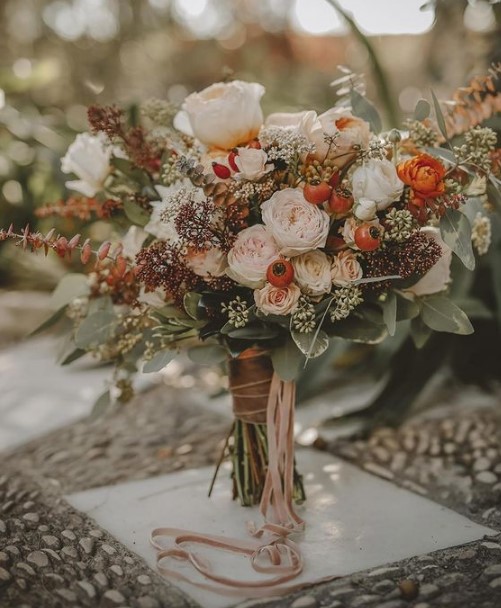 Вариант для свадеб в стиле кантри, бохо или рустик. Такой букет может совсем не содержать цветов: основой композиции становится рябина, калина или ягоды шиповника, яркость которых оттеняется насыщенной зеленью. Осенний вариант – использовать в качестве основы яркие листья клена или дуба. Природные элементы хорошо смотрятся как сами по себе, так и в сочетании с розами или другими цветами оранжевых и красных тонов.