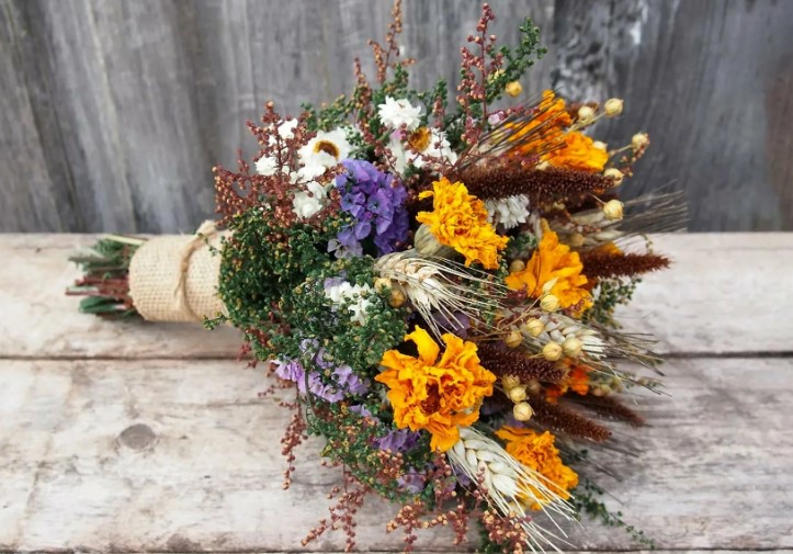 - Бархатцы – яркие цветы, которые хорошо сочетаются с зеленью (например, папоротником). Букеты с бархатцами подходят для свадеб в стиле бохо или кантри.