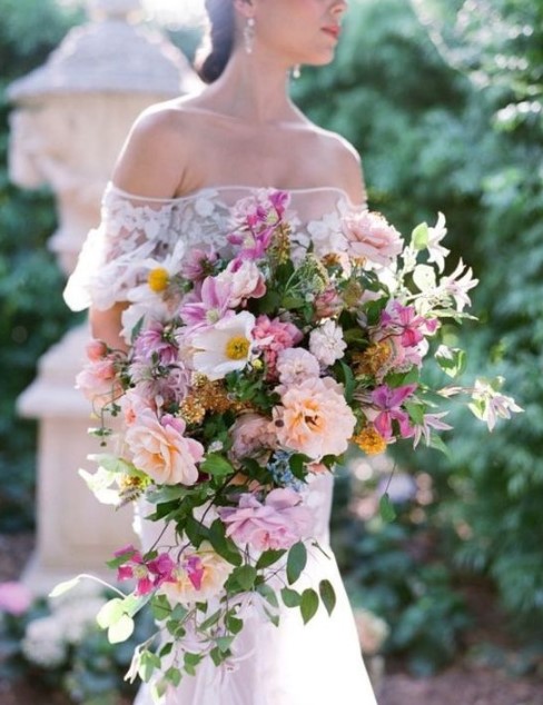 «Растрепанная» («вегетативная») композиция – это максимально естественный на вид букет, который похож на только что собранную охапку цветов и трав. Он имеет асимметричную форму и, как правило, достаточно большие размеры. Из него могут «неаккуратно» торчать в стороны листья, цветы на длинном стебле, колоски, веточки. Весь декор – естественный; здесь не используются ленты, перья, бусины и другие искусственные элементы. «Растрепанный» букет подойдет для стиля бохо и образа «небрежной» невесты.