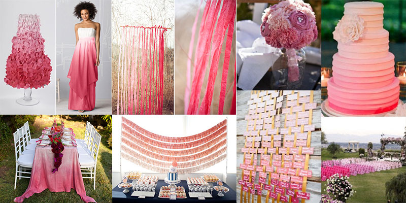 Если вы и ваш жених хотите выбрать для декора разные оттенки одного и того же цвета, переходящие друг в друга от нежного в насыщенному, стиль «Омбре» для вас. Причем, разная тональность распространяется на все – от свадебного стола до платья невесты. Существуют также разные вариации стиля, например деграде и градиент.