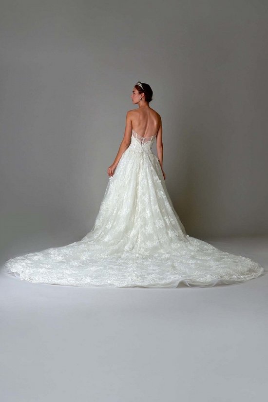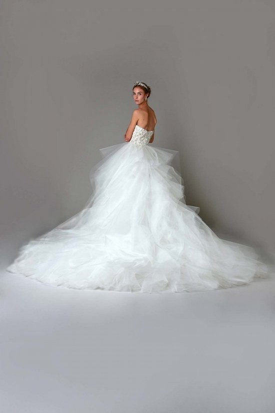 Все наряды созданы из шелка, тюля и тафты. Вы не увидите здесь угловатости или строгих форм, лишь плавные линии, украшенные кружевом, пайетками или сияющими кристаллами.