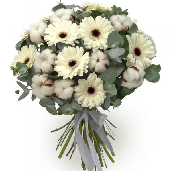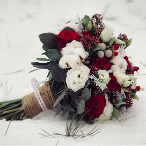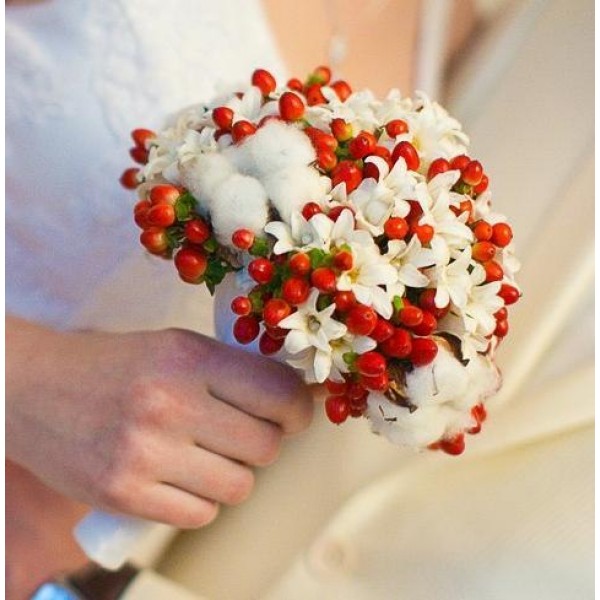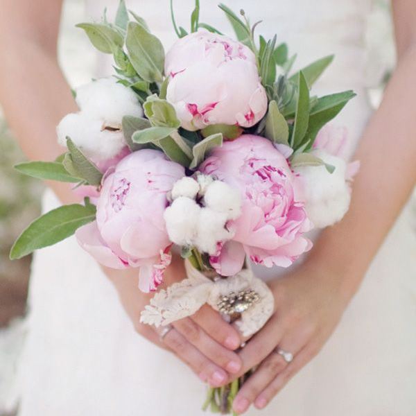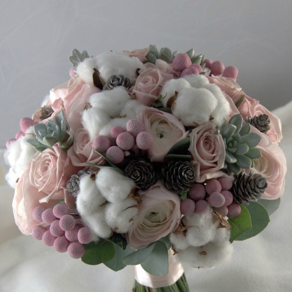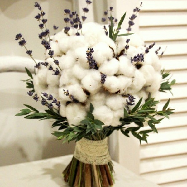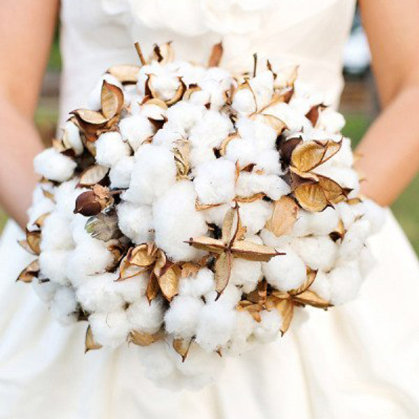 Хлопок может стать как дополнительным украшением цветов, так и главной составляющей свадебного букета.