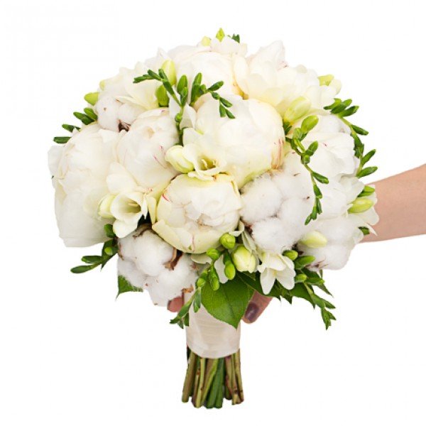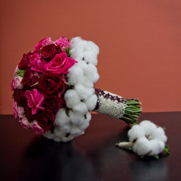Желаете преподнести вашей избраннице необычный свадебный букет? Тогда попробуйте украсить его хлопком. Это подчеркнет изящество всей композиции, сделав ее более нежной и воздушной.