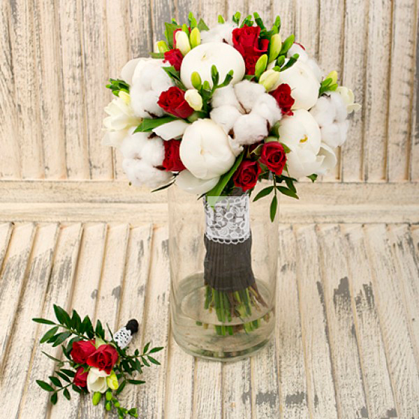 Вот еще одна потрясающая идея: использовать хлопок для бутоньерки жениха. А если мини-композиция будет повторять букет невесты или ее элементы будут присутствовать в декорациях к торжеству, удастся еще и выдержать общий стиль.