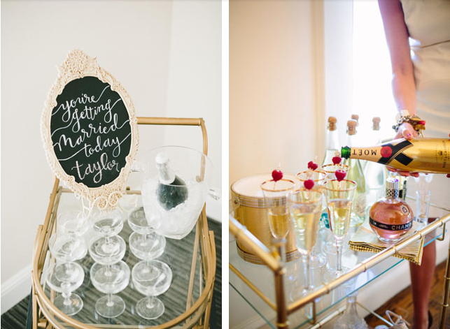 Интересной мыслью может быть подача шампанского при помощи сервировочного столика. Этот так называемый bubbly bar будет особенно кстати во время ожидания полного числа гостей (для тостов) или для невесты и ее подружек – чтобы успокоить нервы.