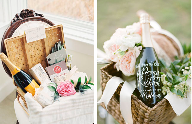 Есть один очень простой и в то же время доступный способ настроить гостей на праздничную волну. Причем сразу. Для этого лишь предложите каждому приглашенному welcome bags – маленькие приветственные корзинки с закусками и мини-бутылочками шампанского. Их можно украсить особым образом, например, инициалами жениха и невесты и т. д.
