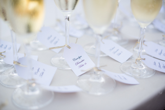 Бокалы с шампанским запросто можно использовать вместо рассадочных карточек для гостей. Кроме того, бутылки этого напитка подходят в качестве указателей-номеров для каждого отдельного столика.