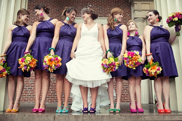 Если свадьба будет проходить в едином цвете, платья подружек невесты должны быть с ним согласованы. Лучше, если эти цвета будут одинаковыми, разниться им позволено только оттенками.