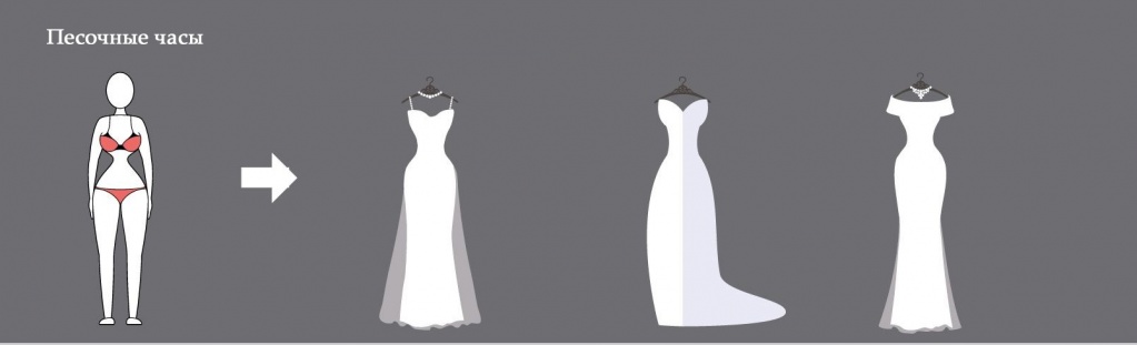 - Проще всего подобрать наряд для «Песочных часов», поскольку телосложение здесь максимально пропорционально. Подойдут разные решения: А-образное, прямое платье, силуэт «русалка». Если есть немного лишнего веса, предпочтите корсетное изделие. Оно сделает линии четче, выделяя соблазнительные естественные изгибы. Если хочется создать ощущение легкости, выбирайте струящиеся ткани, крой по косой.