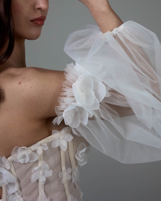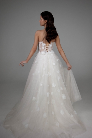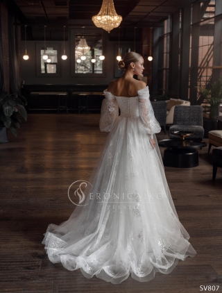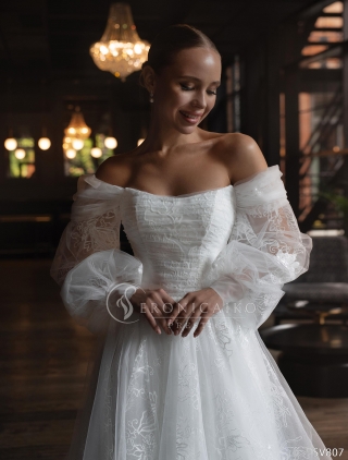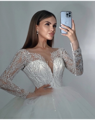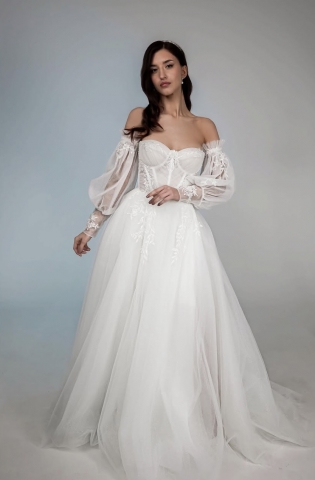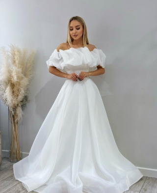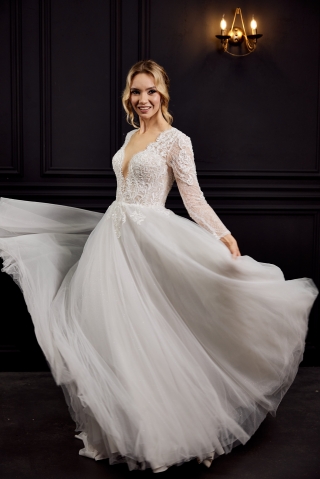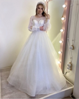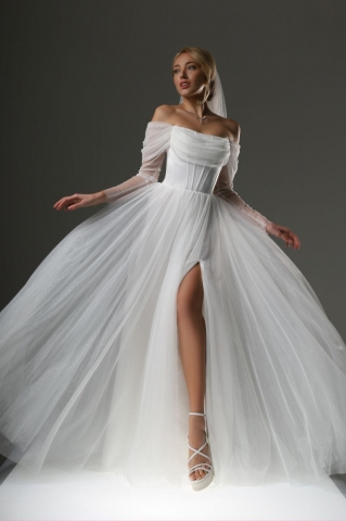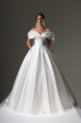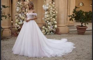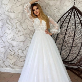 - Пышное бальное свадебное платье. Оно подходит под любой тип фигуры. Хорошо скрывает широкие бедра и подчеркивает линию декольте. Объем юбки регулируется кольцами. Девушкам невысокого роста рекомендуется не злоупотреблять объемом, а заказывать платья с умеренно пышной юбкой.
