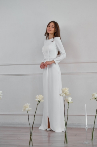 - Платье «Футляр». Акцент делается на бюст, талию и бедра. Платье для стройной невесты. Невысокие, но стройные девушки, могут с помощью такого платья визуально вытянуть силуэт.